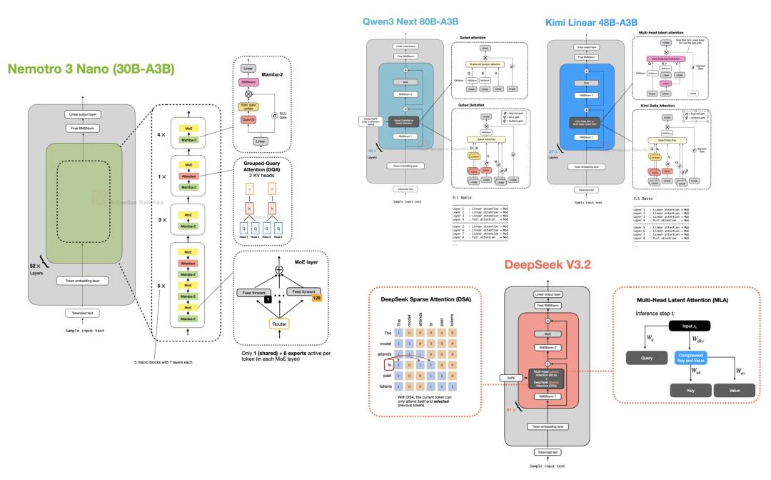 但这还不是全部。除了 MoE,我们看到了更激进的效率尝试,例如 Qwen3-Next、Kimi Linear、Nvidia Nemotron 3,以及采用了稀疏注意力机制的 DeepSeek V3.2。(如果您对更多细节感兴趣,我在之前的《Big LLM Architecture Comparison》一文中对此进行了报道。)