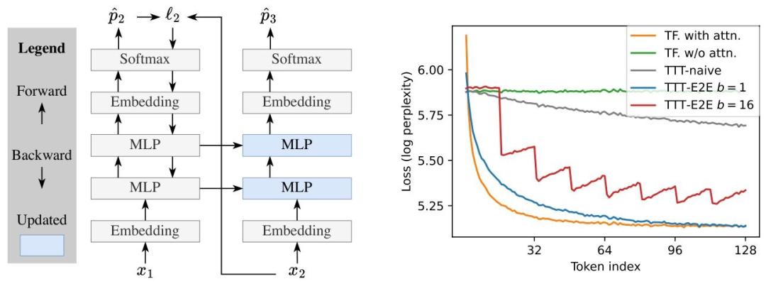 TTT-E2E并没有依赖复杂特殊架构,反而是基于带滑动窗口注意力的标准Transformer,容易部署。