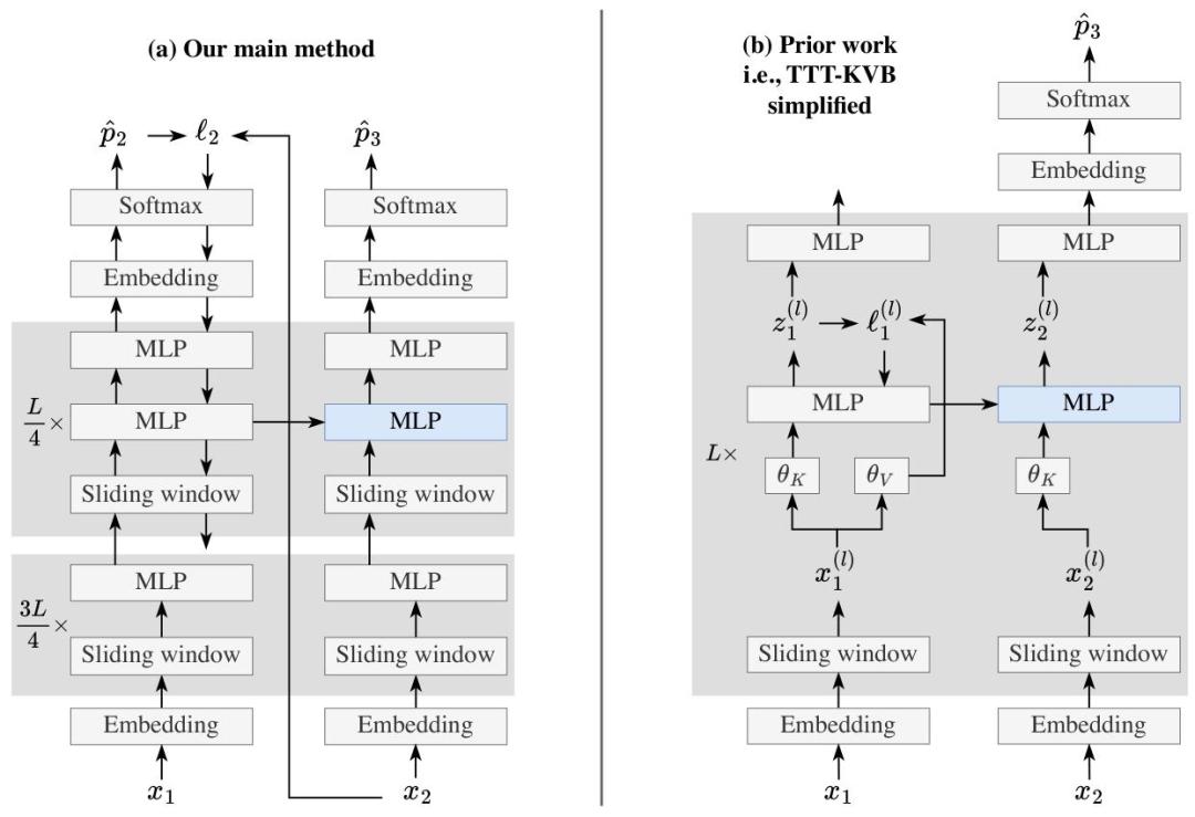 一是采用「迷你批处理+滑动窗口」的组合策略。将测试时的训练数据分成多个迷你批,配合8K大小的滑动窗口注意力,既解决了单token梯度更新易爆炸的问题,又保证模型能记住批内上下文,提升计算并行度;