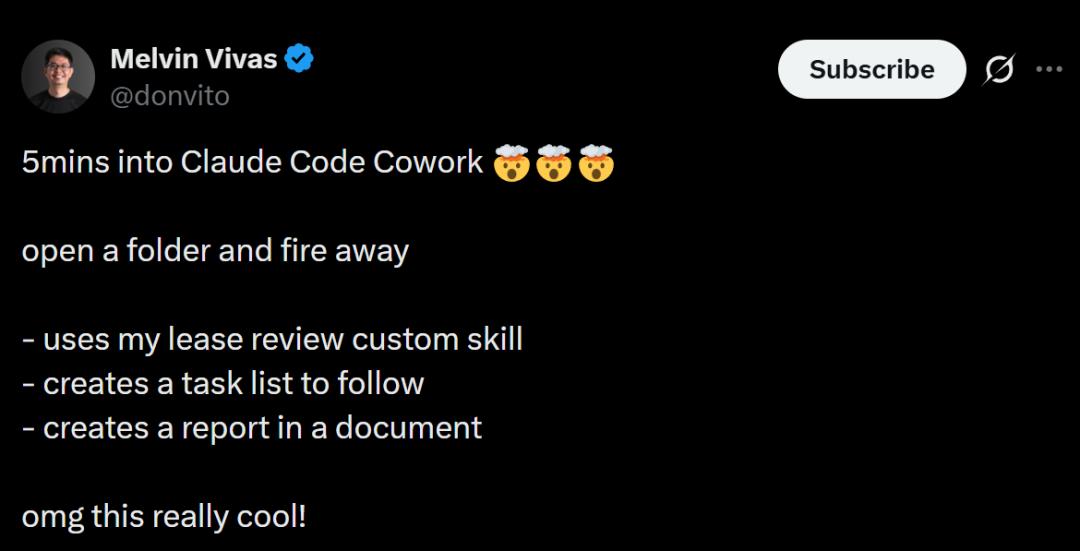 他表示:Claude Cowork简直不可思议,它重新整理了我所有的下载文件,为我的会议准备好了笔记,还把我的收据都分类归档好了。