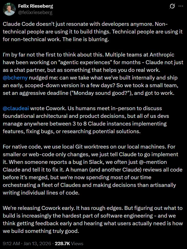 这才是最扎心的地方:Claude写Claude Cowork,而且仅在一周半时间(10天)完成。