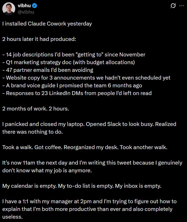 Claude Cowork上线第二天,网友彻底陷入存在主义恐慌!