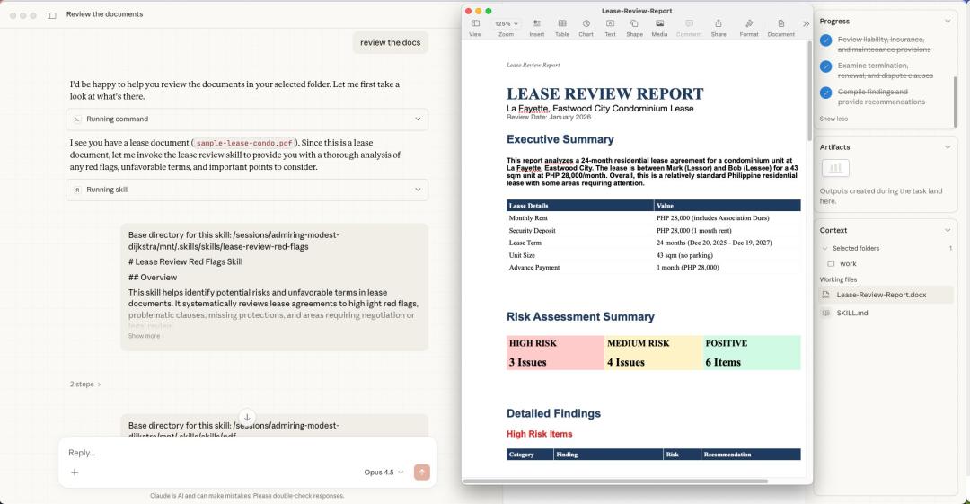 它调用了他自己定制的「租约审查」技能,然后自动生成了一份可执行的任务清单,然后还自己把结果整理成了一份文档报告。