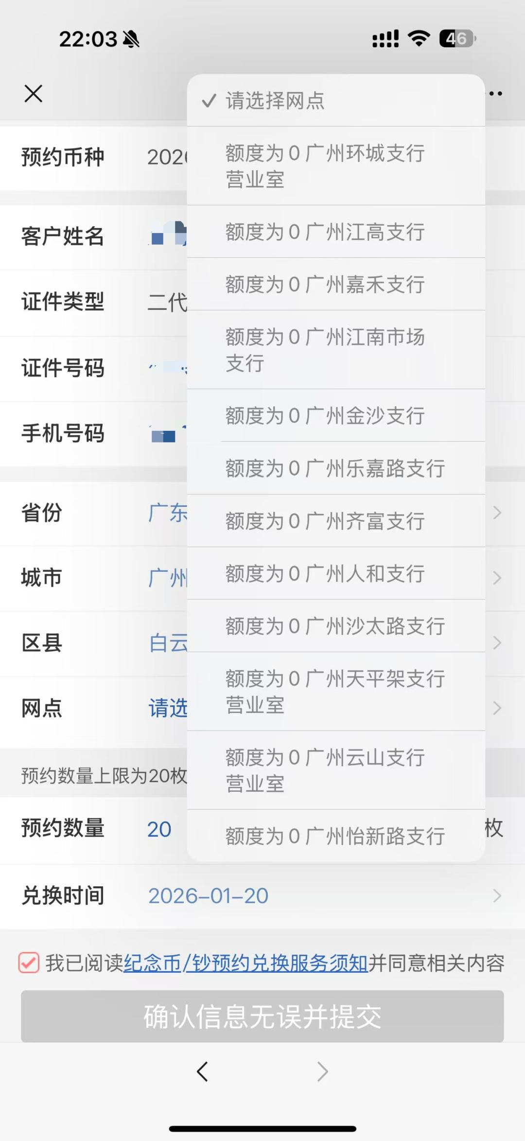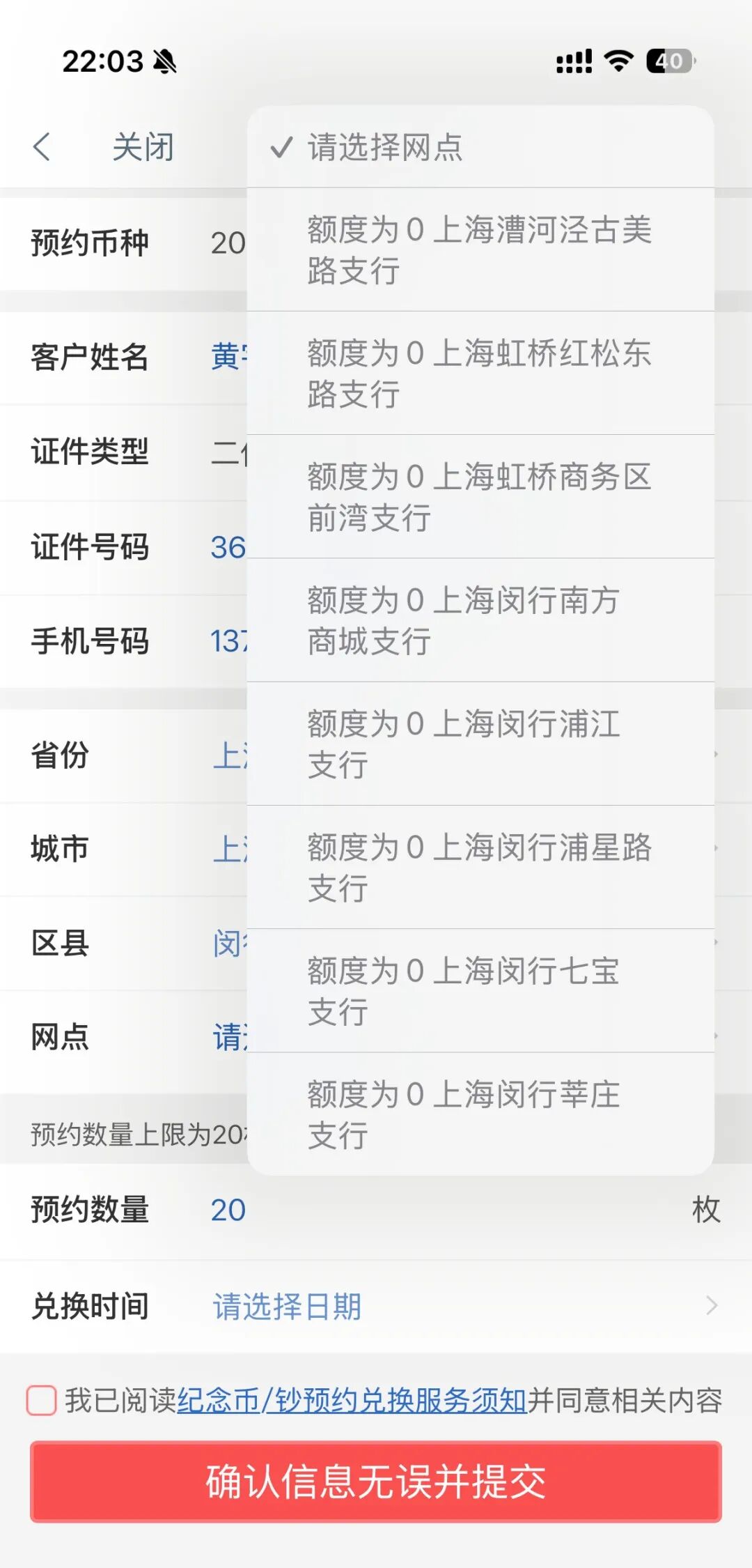 1月13日晚上10点,时代周报记者提前“蹲守”在工商银行App的纪念币预约界面,到点后立刻点击预约,但一直处于加载页面,重新刷新后进入填写信息页面,但仅1分钟左右,上海各网点预约额度便显示已空。随后,时代周报记者又以相同的方式预约马年纪念钞,情况也同样如此。