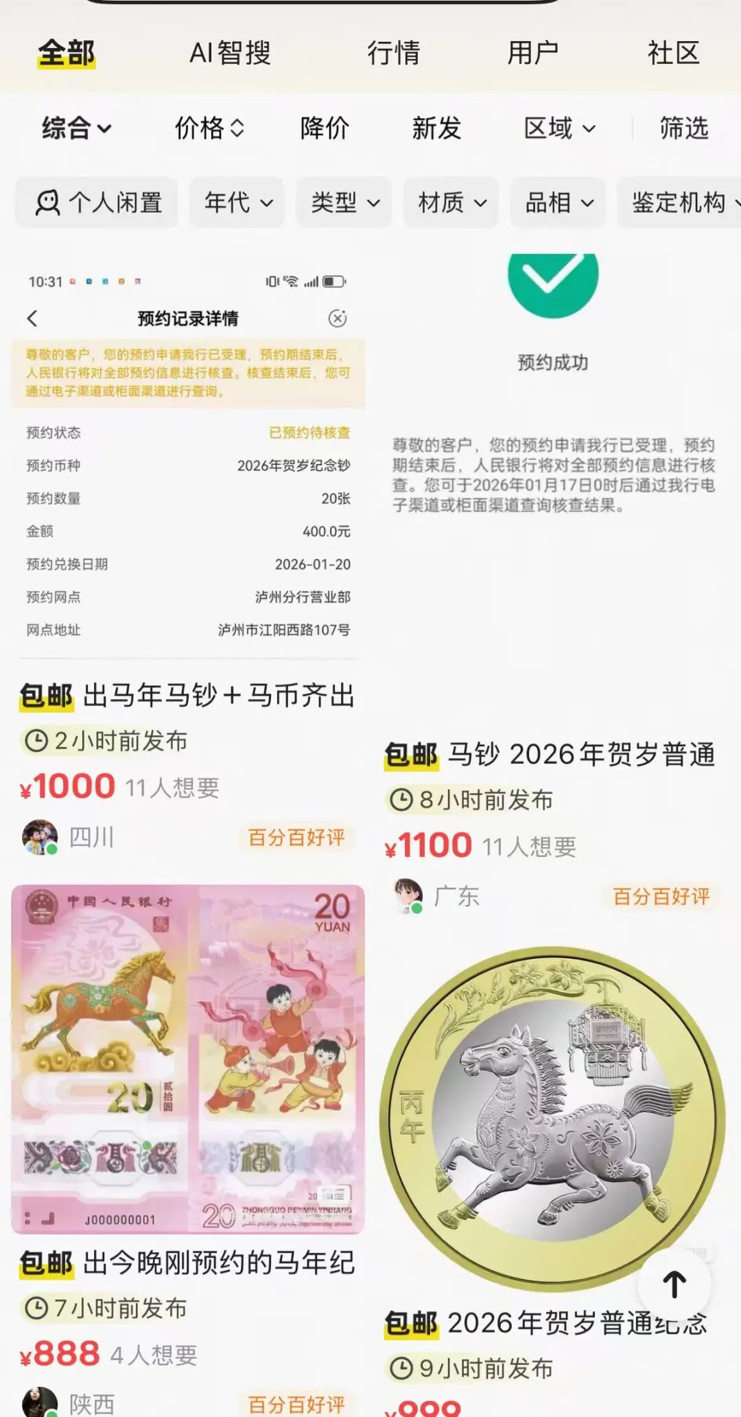 目前,某二手交易平台上已经有预约上的投资者发布了相关交易帖,溢价普遍超过1倍,一套20张“马钞”标价在800~1000元不等,一套20枚“马币”标价在500元左右。1月13日晚,当时代周报记者以购买者身份咨询其中一名“马钞”卖家时,其表示,帖子刚发布几分钟就已经有人拍下了,但是暂时还没付款。