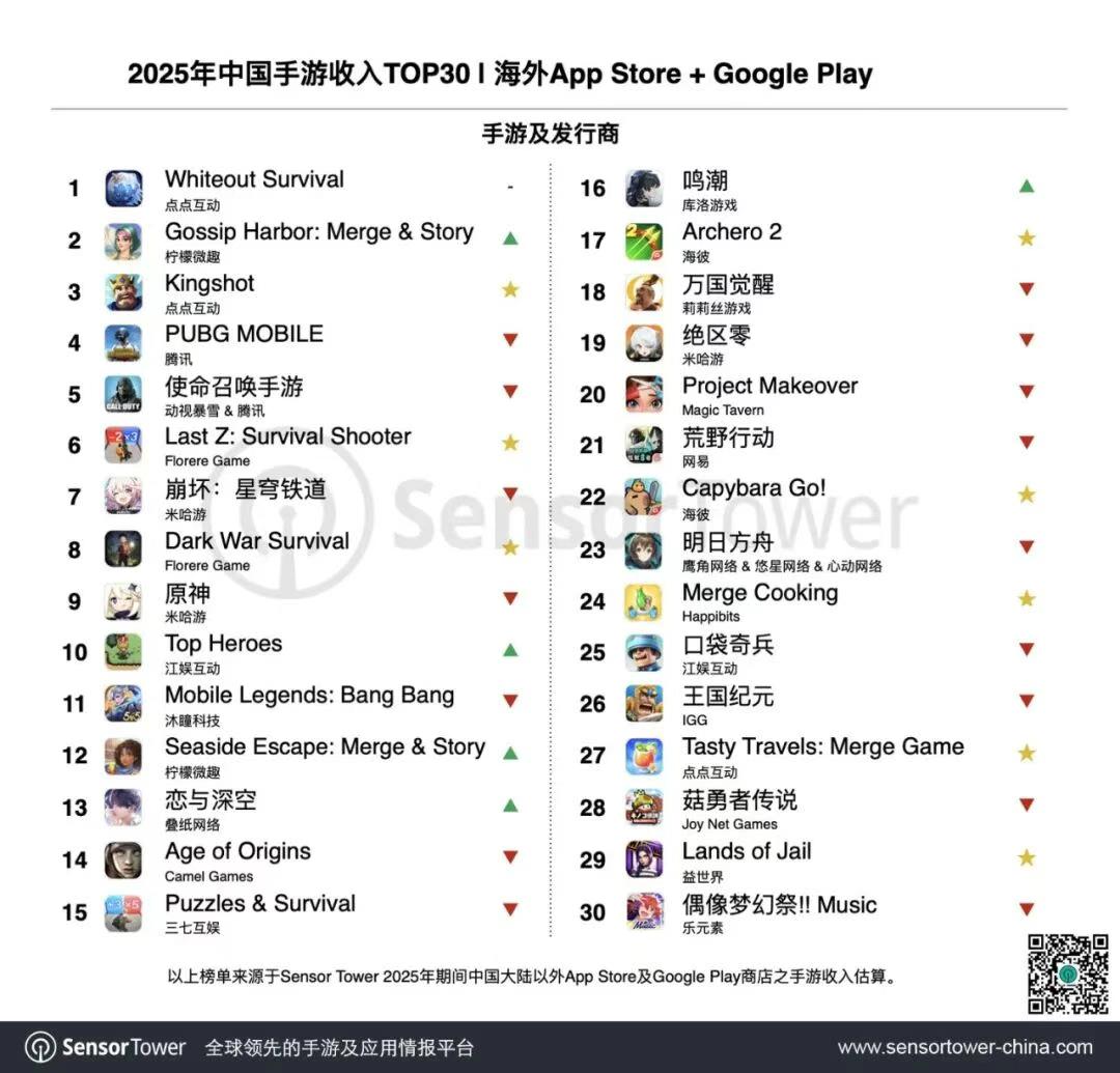 此外,Sensor Tower还公布了2025年中国手游出海收入TOP30。
