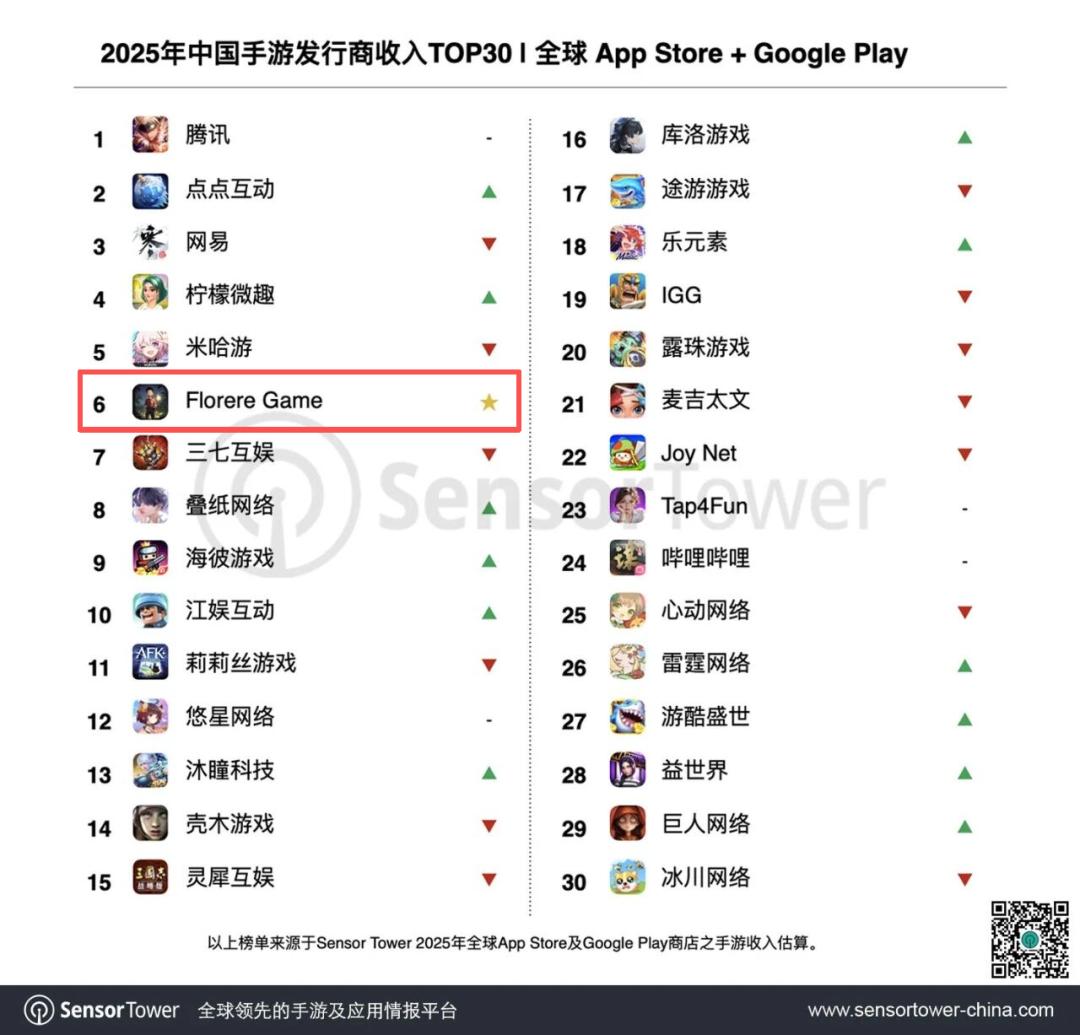 Florere Game是TOP30中唯一新入榜厂商,旗下2款4X策略手游表现优异,使得其2025年的收入翻了20倍;叠纸2025年收入上涨45%,位居榜单第8名;库洛2025年收入大涨56%,排名提升10位来到榜单第16名。