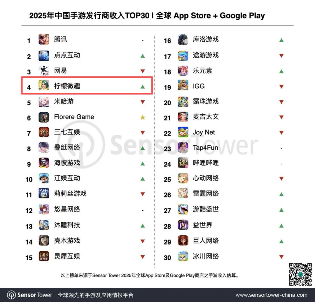 点点互动在2025年实现多品类爆发式增长,全球收入激增87%,跃居收入榜亚军。