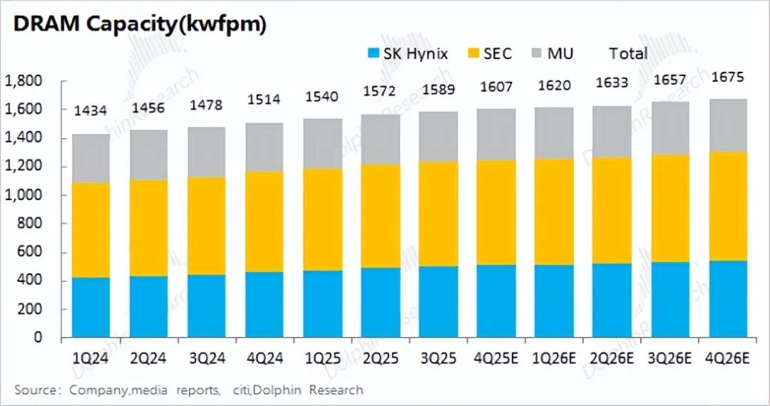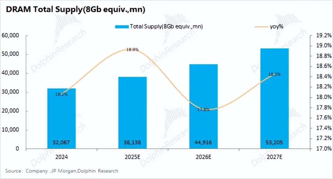 而供需两端的绝对量来看,海豚君认为DRAM的供需局面将在2026年和2027年将更为紧张。
