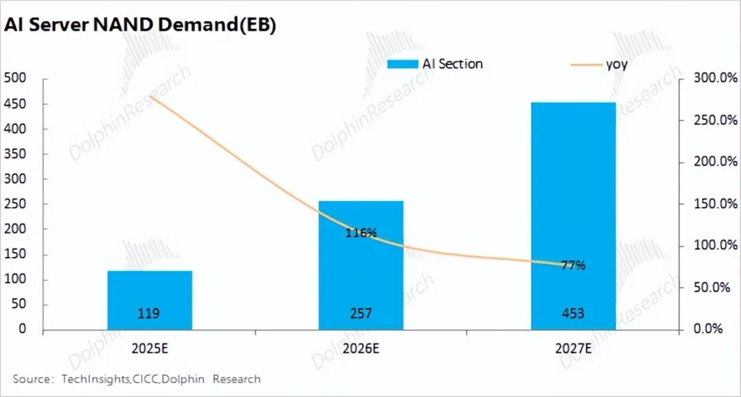 以类似的方式来预估2027年的需求量情况,可以估算出AI服务器对NAND的需求量在2026年和2027年分别为258EB和453EB,同比增长116%和77%。