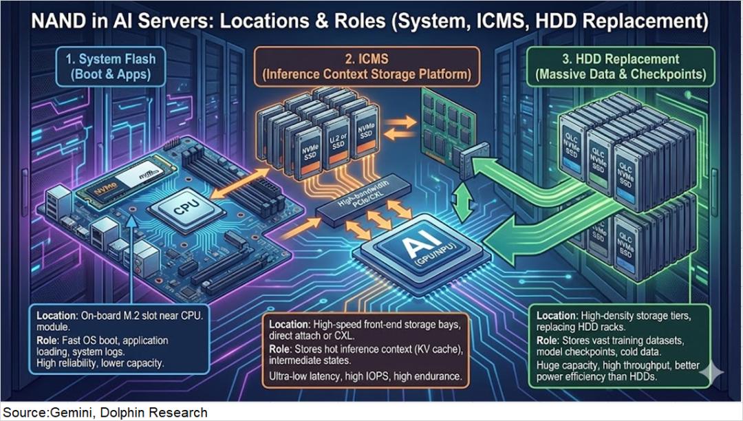 ②Rubin中创新性增加NAND:根据黄仁勋在CES2026信息,英伟达Rubin架构创新性加入“推理上下文存储平台ICMS”(即每个Rubin GPU可以拓展16TB的NAND)。