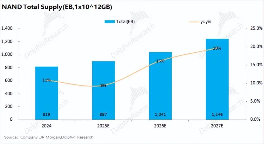 在此基础上,2026年和2027年的NAND供应量有望达到1041EB和1246EB(相当于1x10^12GB),复合增速为18%左右。