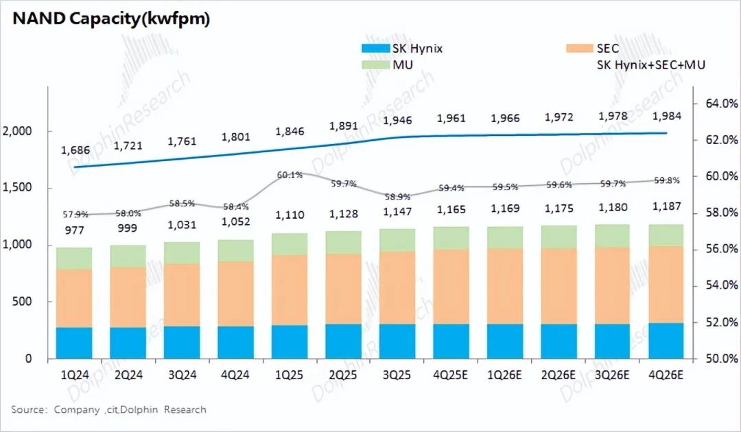 考虑到产能爬坡等情况,海豚君预估2026年的NAND市场整体产能在2366万片左右,同比增长4%。