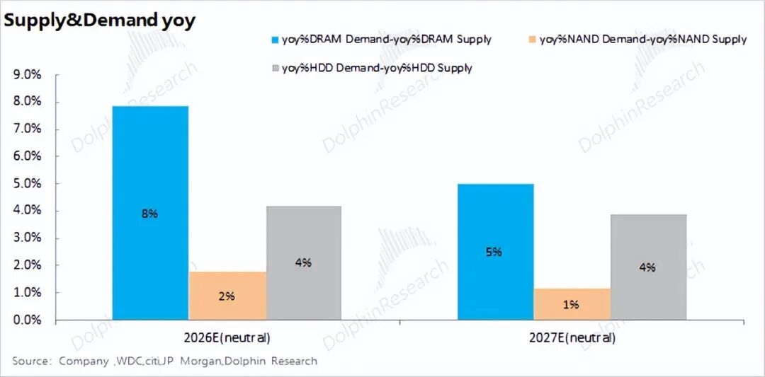 在当前市场预期NAND供应端保持18%左右复合增长的情况下,NAND在2026年-2027年的供需缺口仍将维持在5-6%左右。