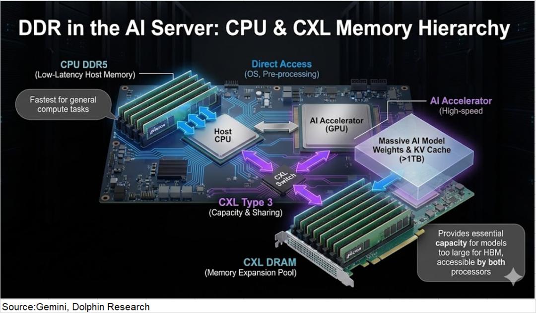 DDR在AI服务器中,传统是CPU中搭DDR,新场景是CXL DRAM(新增“外挂内存”),由于HBM的容量较小,协助模型卸载和KV Cache(键值缓存)的存放,分担HBM压力。