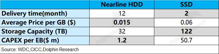 当前HDD的单位存储成本和生产单EB所需的资本开支,分别只有SSD的1/4和1/50左右。由于HDD的交付周期达到1年左右(其中原材料备货3个月+生产测试6个月),部分客户才“被迫”选择了交期较短、但价格更高的SSD(其中半导体芯片生产+模组封装,总共需要2个月左右)。