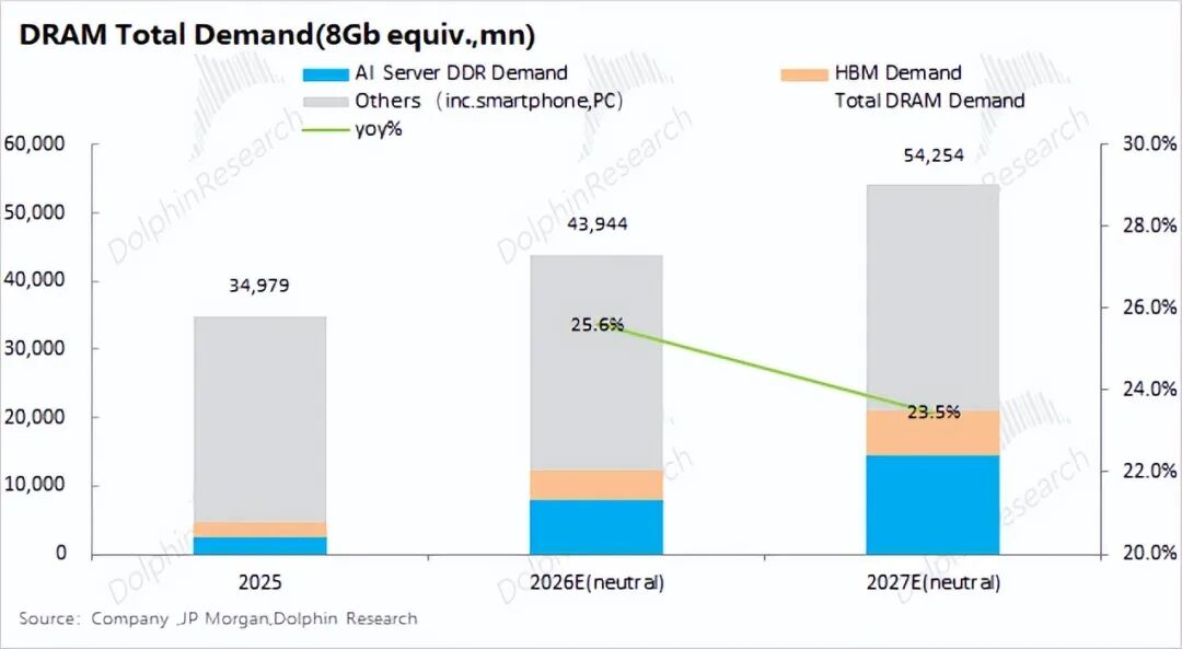 在以上假定的情况下,再结合AI服务器中对HBM和DDR的需求量,可以估算出2026年和2027年对DRAM市场的整体需求量为439亿GB和542亿GB,同比增长25%和23%。