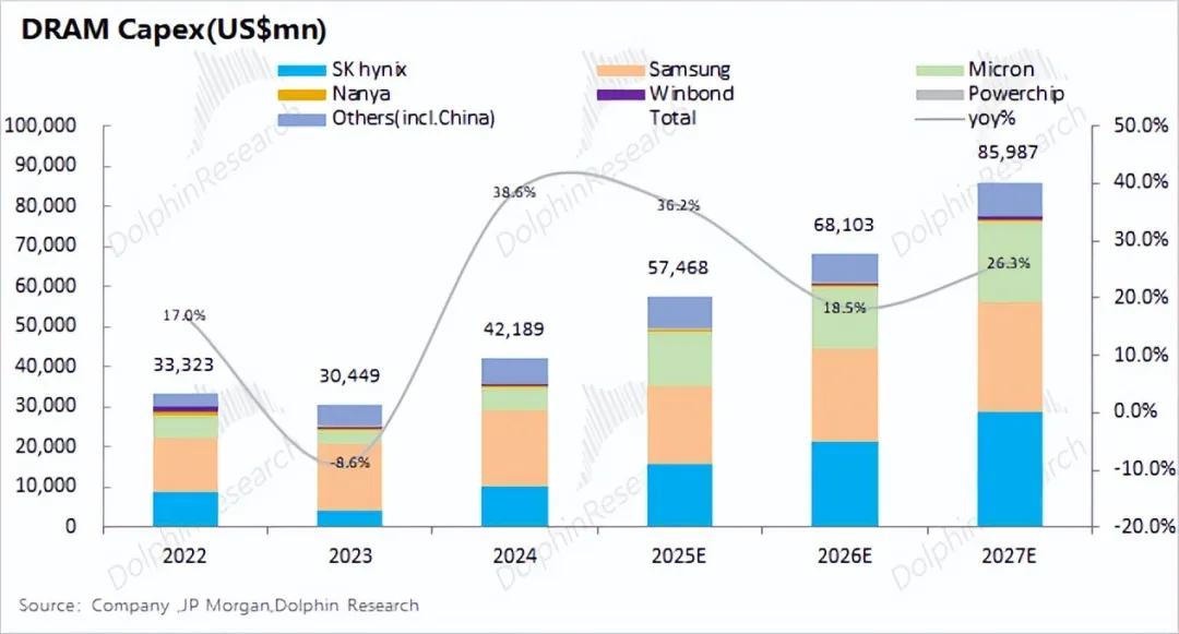 正因如此,三大存储原厂(三星、海力士和美光)持续加大对DRAM方向的资本开支。