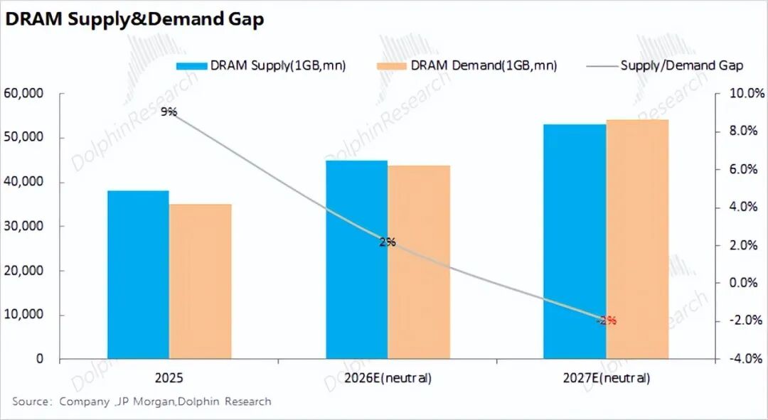 在当前市场对供应端保持18%左右复合增长的预期之下,DRAM的供需缺口在2026年还未明显体现(供应充足度已经低于正常水位),而在2027年该缺口可能会扩大至2%左右。