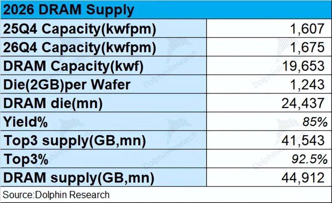 假定DRAM的整体良率在85%左右以及三家核心厂商的市占率约为92.5%,可以推测出2026年全球DRAM的整体供应量将近449亿GB左右。