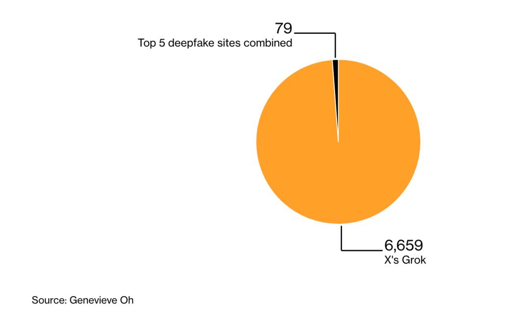 在新年前后,X 几乎已成为全球最大的 Deepfake 网站。彭博社引述社交媒体与深度伪造研究专家吉纳维芙·吴(Genevieve Oh)的说法称,1 月 5 日至 6 日的 24 小时中,X 上的 Grok 平均每小时会生成约 6700 张性暗示图片。