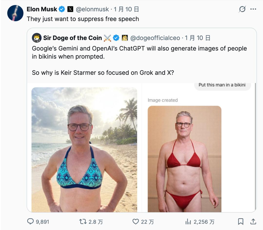 马斯克转发英国首相斯塔默身着比基尼照片,并称对方打压言论自由