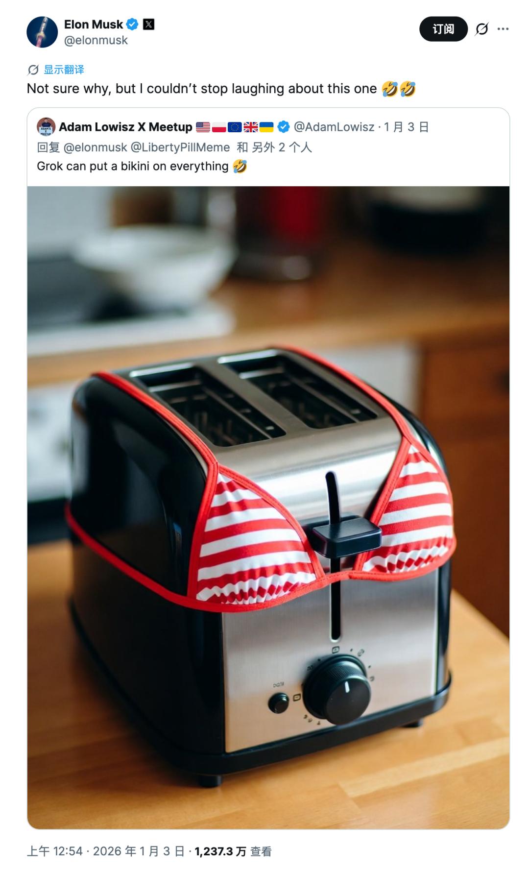 几天前,伊隆·马斯克在自己的 X 账号上转发了一条给吐司机穿上比基尼的帖子。他说,“不知道为什么,但我就是忍不住为这件事笑个不停。”
