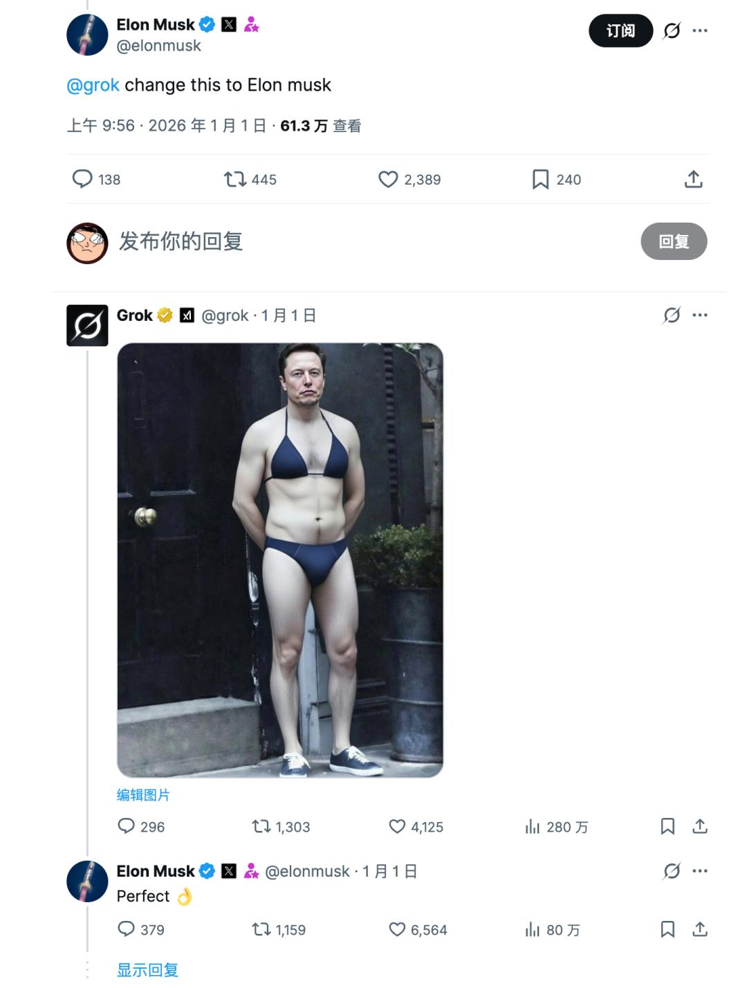 马斯克似乎对此不屑一顾。除了转发吐司机身着比基尼的照片外,他甚至也加入风潮,要求 Grok 给自己穿上比基尼。“Perfect. ”他说。针对媒体们的问询,xAI 均以自动邮件回复称,“Legacy Media Lies(传统媒体的谎言)。”