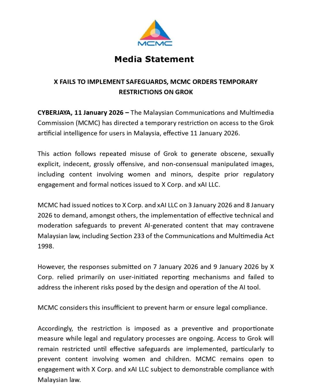 截至 1 月 14 日,包括英国、法国、意大利、印度、巴西、澳大利亚及欧盟等国家及地区的监管机构都已对 Grok 发出警告或展开调查,印尼及马来西亚已先后宣布暂时封禁 Grok。