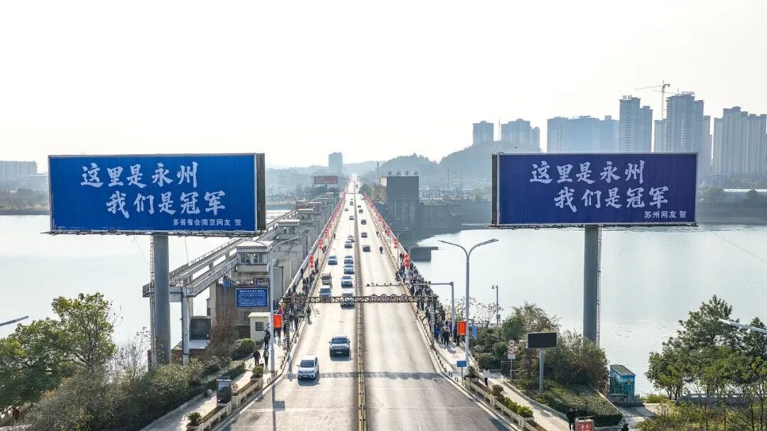 2026年1月3日,冷水滩区宋家洲大桥桥头,一块蓝色广告牌悄然立起,上面写着“这里是永州,我们是冠军!苏州网友贺”。南京网友马上被激起了胜负欲,马上在旁边立起同样的牌子,落款“多省省会南京网友贺”。