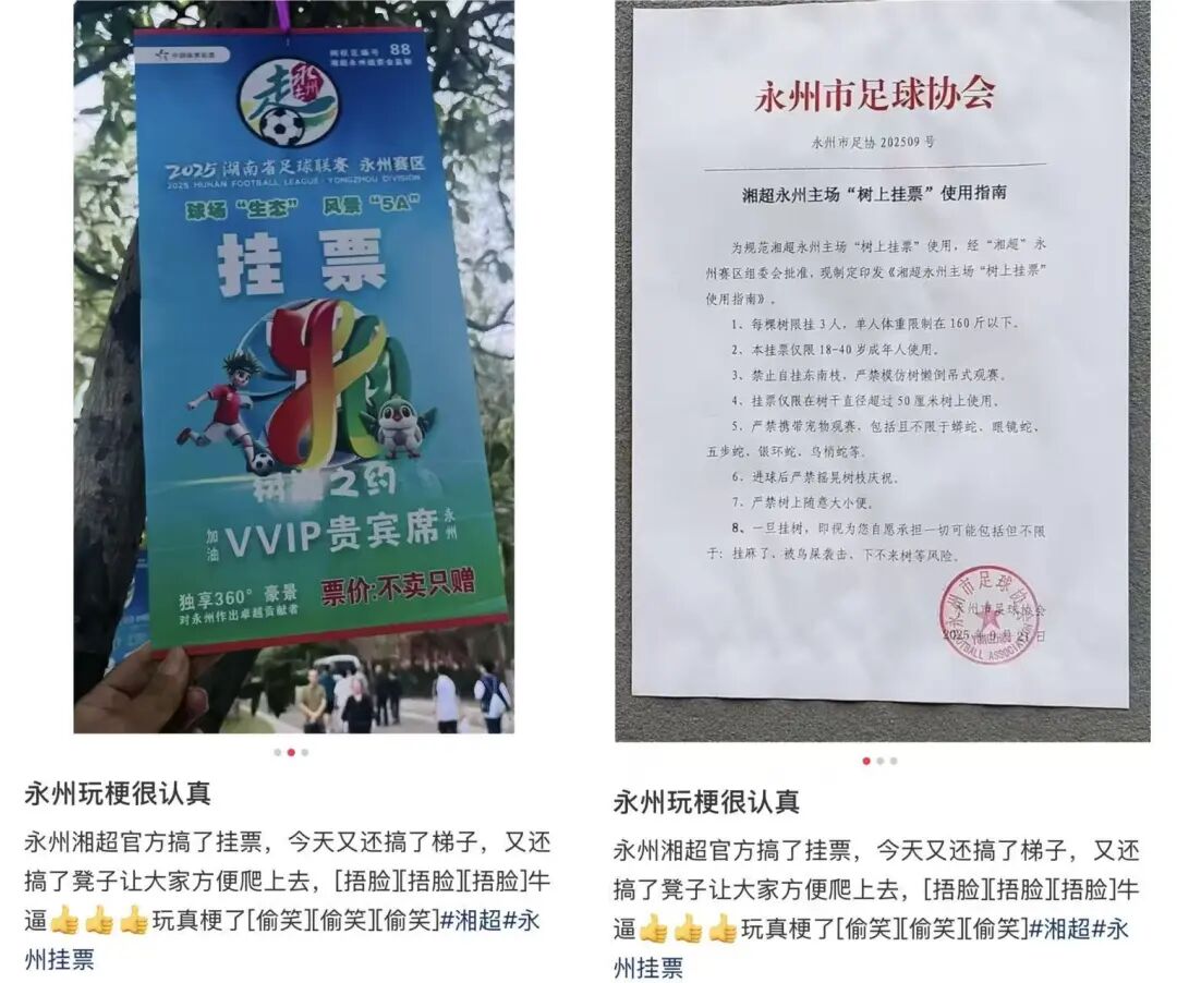 永州队首个主场比赛时,门票很快被抢光,有网友调侃要买“挂票”,爬上体育场四周的大树观赛。没想到,永州市足协竟然真的发布了《“树上挂票”使用指南》,明确规定每棵树限3人,禁止倒吊观赛,严禁携带蟒蛇、眼镜蛇、五步蛇观赛。官方下场玩梗,将城市的运动热情推向高潮。