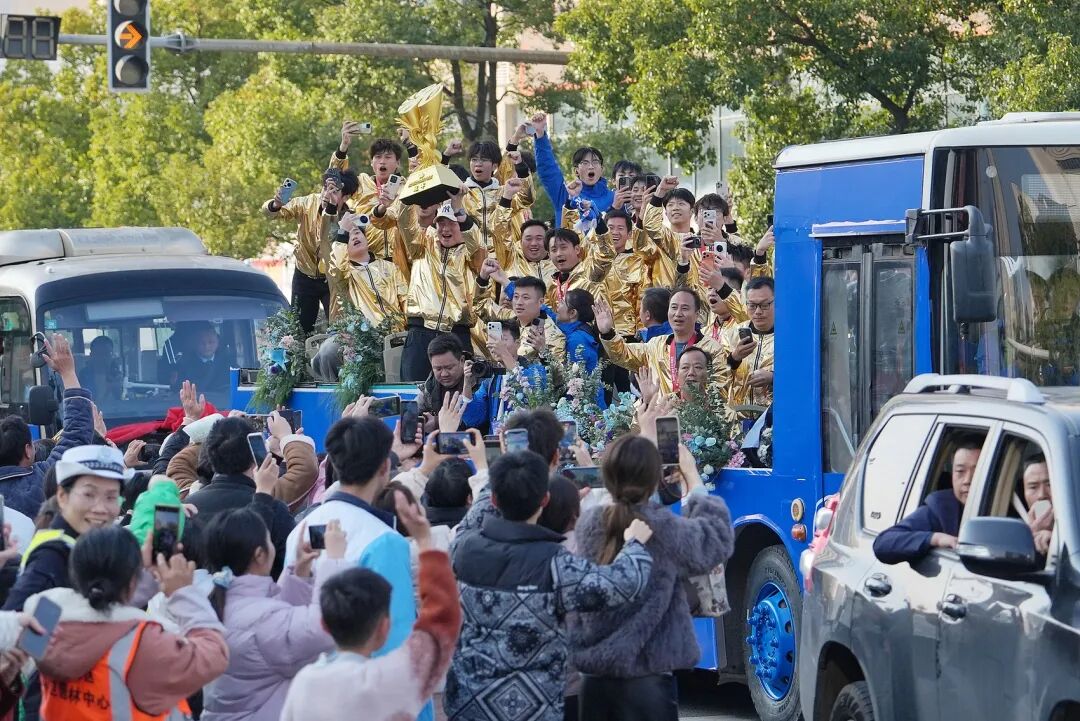 △“湘超”冠军永州队回到湖南永州,球员们乘公交花车亮相。(图/杨华峰/中新社湖南分社/视觉中国)