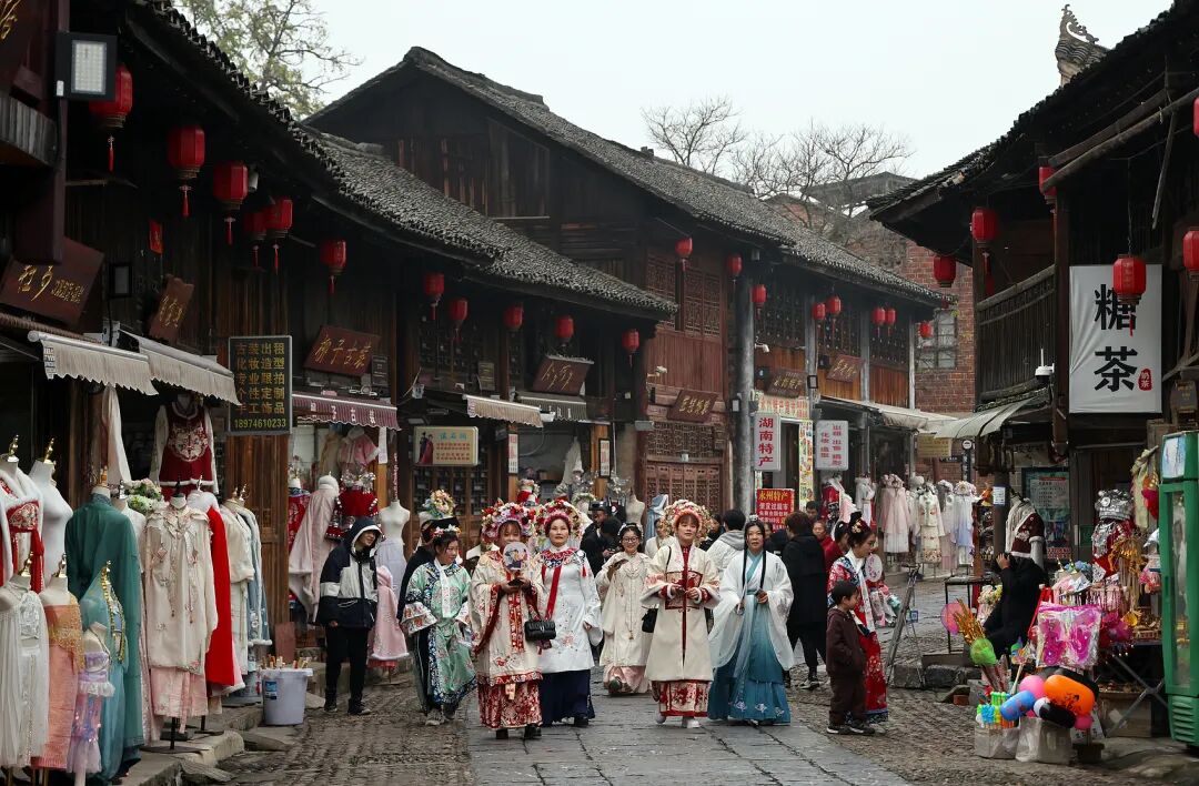 △湖南永州,游客身着古装在零陵柳子古街体验穿越乐趣。(图/视觉中国)