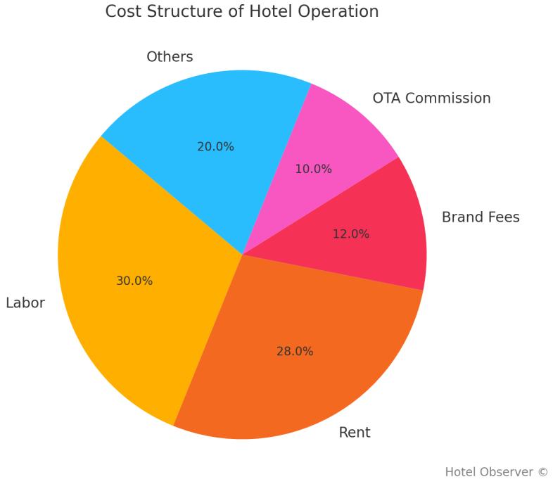 近年来,酒店经营的主要成本要素全面上涨:租金占营收比重已达20%—30%,人工成本占比突破30%,能源成本暴涨。