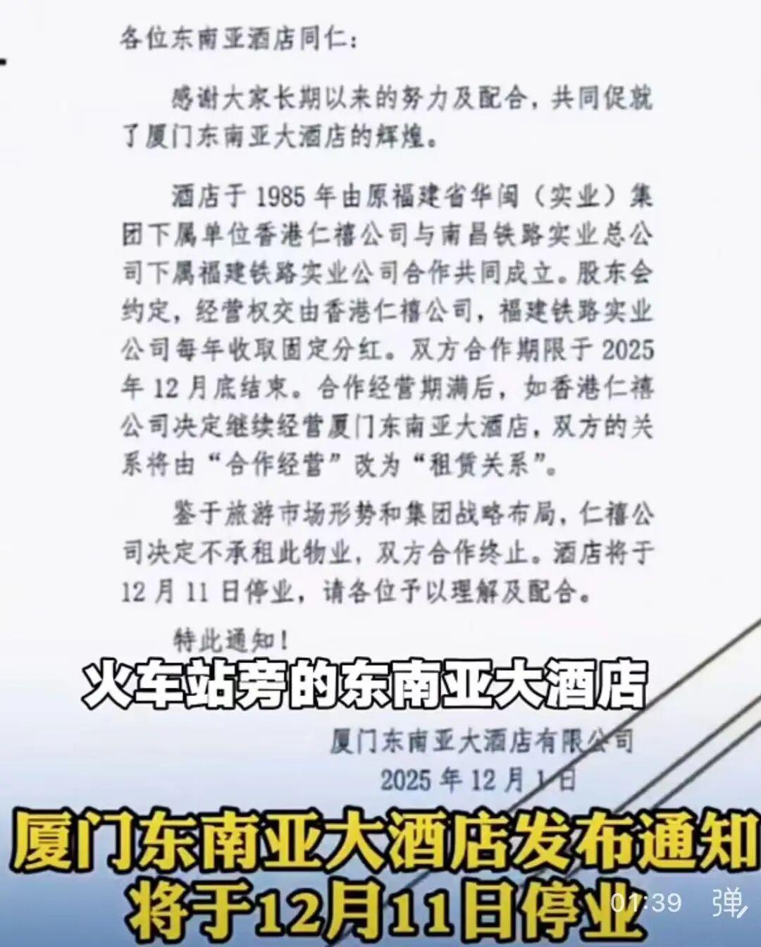 同月,厦门地标性老酒店——东南亚大酒店也宣告退租闭店。