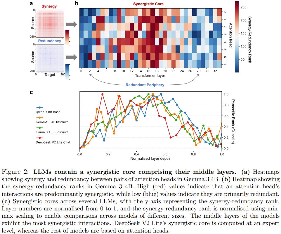 协同核心(Synergistic Core):模型的中层则展现出极高的协同秩,形成了核心处理区。例如,在对 Gemma 3 4B 的热图分析中,中间层的注意力头之间表现出密集且强烈的协同交互,这正是模型进行高级语义集成和抽象推理的区域。