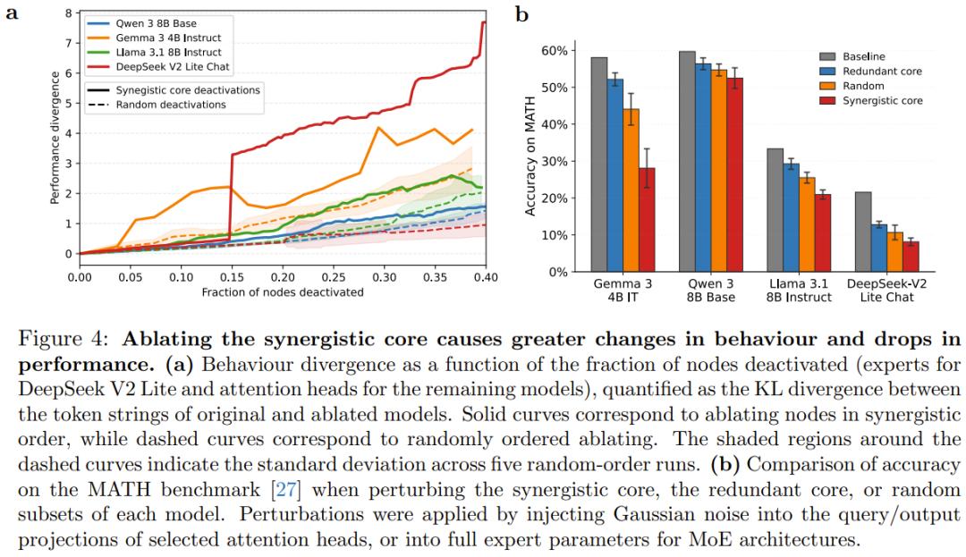 消融实验:研究发现,消融那些高协同性的节点,会导致模型出现灾难性的性能下降和行为背离,其影响远超随机消融或消融冗余节点。这证明协同核心是模型智能的核心驱动力。
