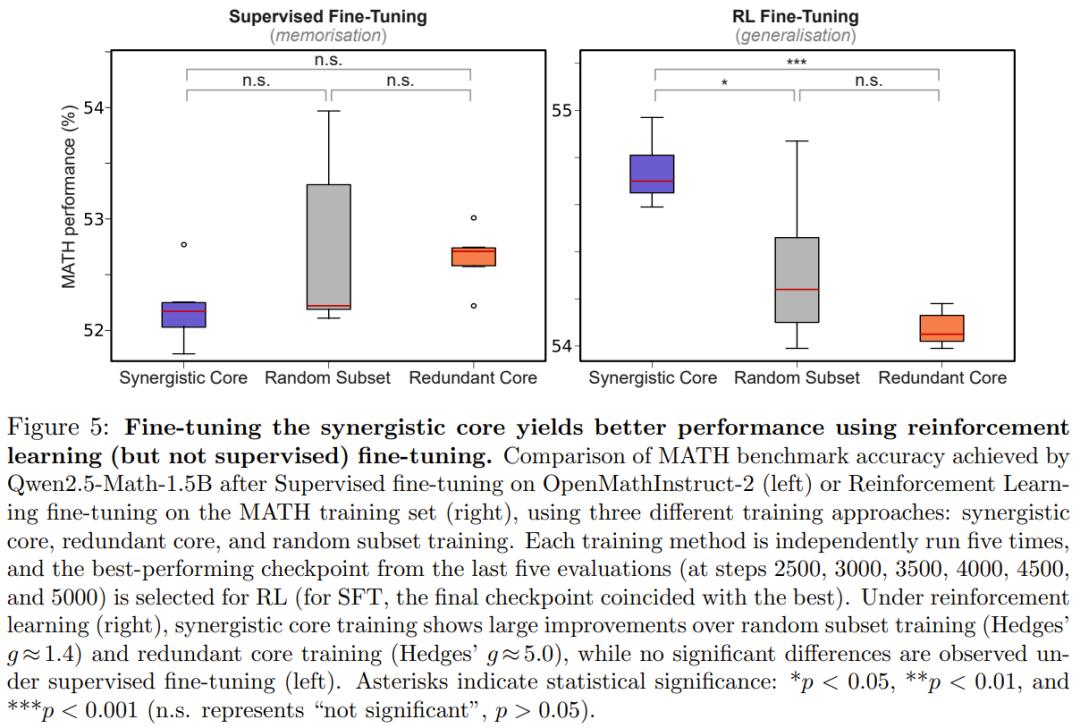 微调实验:在强化学习微调(RL FT)场景下,仅针对协同核心进行训练,获得的性能提升显著优于针对冗余核心或随机子集的训练。有趣的是,在监督微调(SFT)中这种差异并不明显。研究者认为,这反映了 RL 促进通用化而 SFT 更多倾向于记忆的特性。