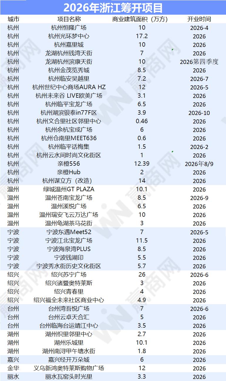 2026年,浙江商业市场迎来新一轮供应潮。据统计,全年计划新开业商业项目达42个,总体量约300万平方米,同比2025年拟新增数量下滑约6%。