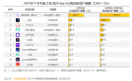 (“乘势而起”的“阿福”在下半年新上线的AI App里用户优势明显 数据来源:QuestMobile)