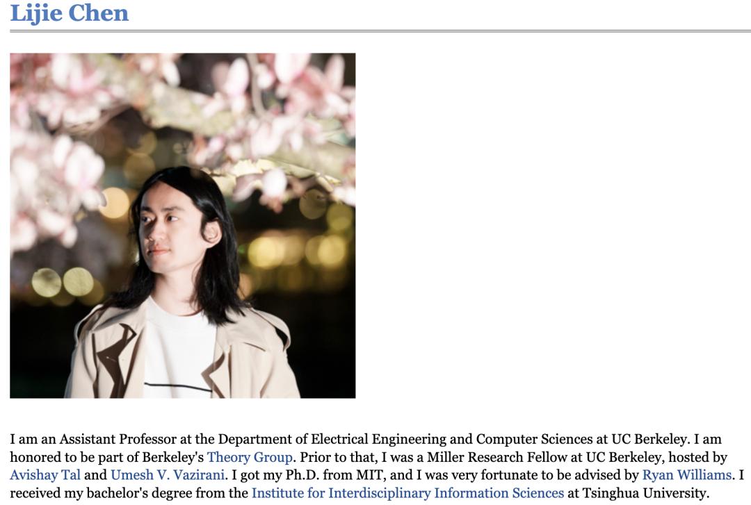 2022年博士毕业后,他获得了极具声望的加州大学伯克利分校米勒奖学金(Miller Fellowship),成为该校的博士后研究员,合作导师是Avishay Tal和Umesh V. Vazirani。