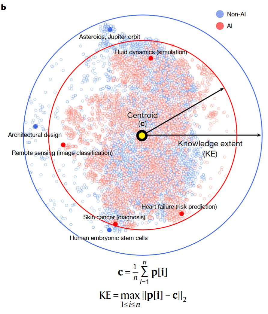比如对于某个领域一年的AI论文,先计算它们所有坐标点的几何中心,然后找出离中心点最远的那篇论文,测量它们之间的欧氏距离。