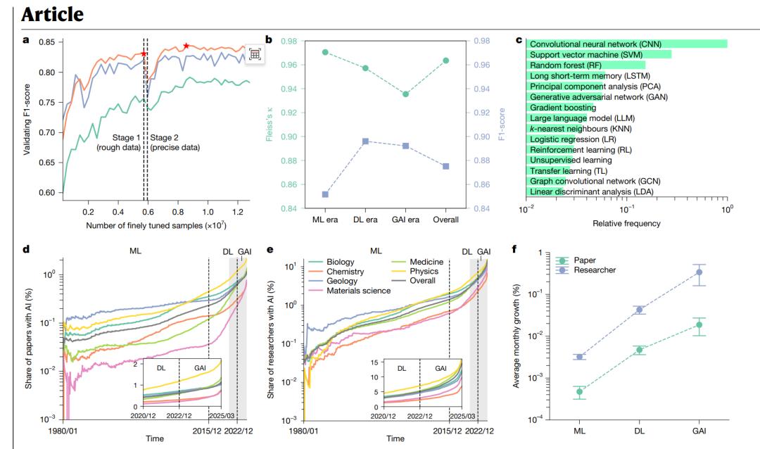 基于该数据集,团队系统性分析了AI在自然科学六大领域(生物、医学、化学、物理、材料科学和地质学)的影响。