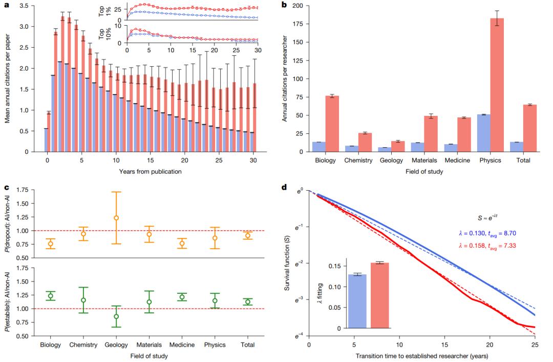 结果发现,在微观个体层面,使用AI的科学家比不使用的多发表3.02倍论文,获得4.84倍引用量。