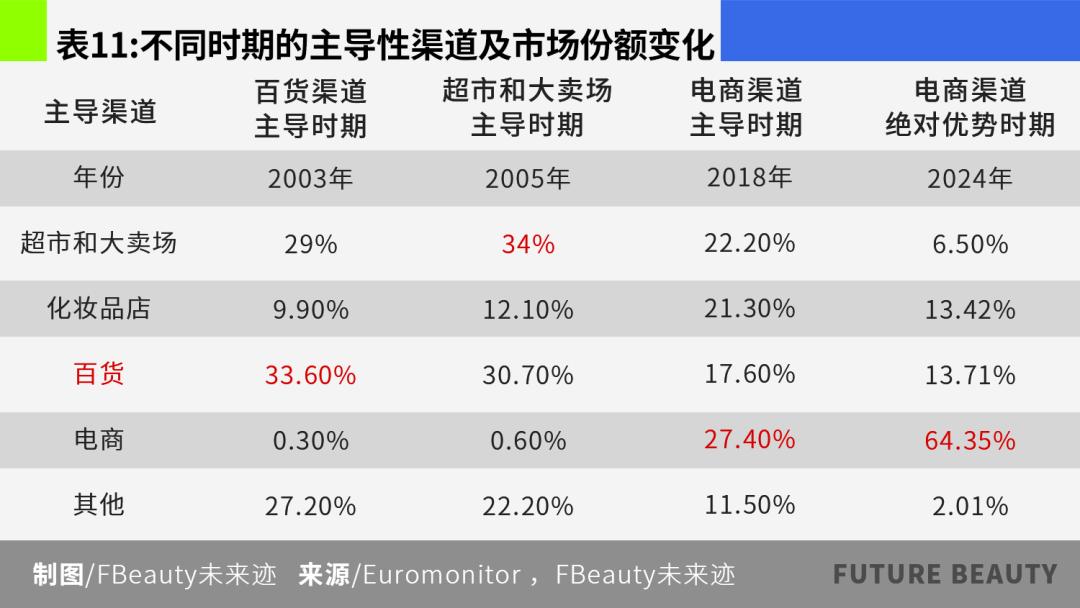 然而,随着电商的崛起和消费者购物习惯的变化,受冲击最大的也是超市和大卖场。从2010年开始,超市和大卖场的份额一路下滑,2018年被电商渠道超越,失去第一宝座。随后又被百货和化妆品店渠道超越,到2024年超市和大卖场的化妆品销售份额已经只剩6.5%,成为化妆品销售的一个边缘性渠道。