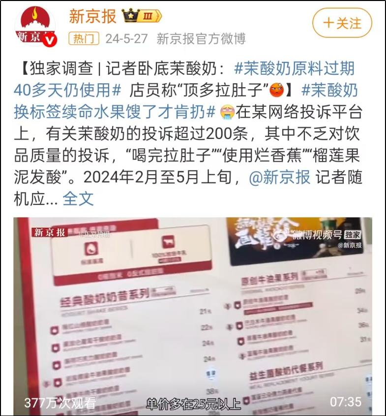 2023年,主打现制、营养标签的茉酸奶,被曝使用植脂末作为产品基底。次年5月,茉酸奶又被曝旗下多家门店使用过期长达40天的食材、虚标个别营养值等问题。