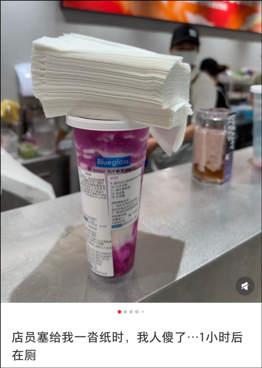 Blueglass的“畅”系列,因为超高含量的益生菌和膳食纤维,在社交媒体上被戏称为“新型泻药”。Blueglass还顺势开展了“买奶茶送纸巾”等营销活动,想给产品贴上“排毒、瘦身”的标签。