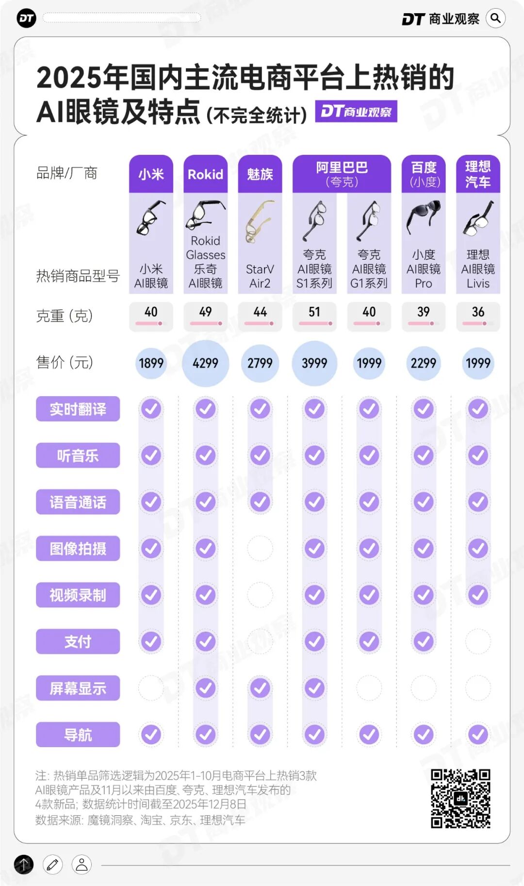 我们整理了电商平台上热销的AI眼镜产品及其功能,结合消费者调研,有几个发现。