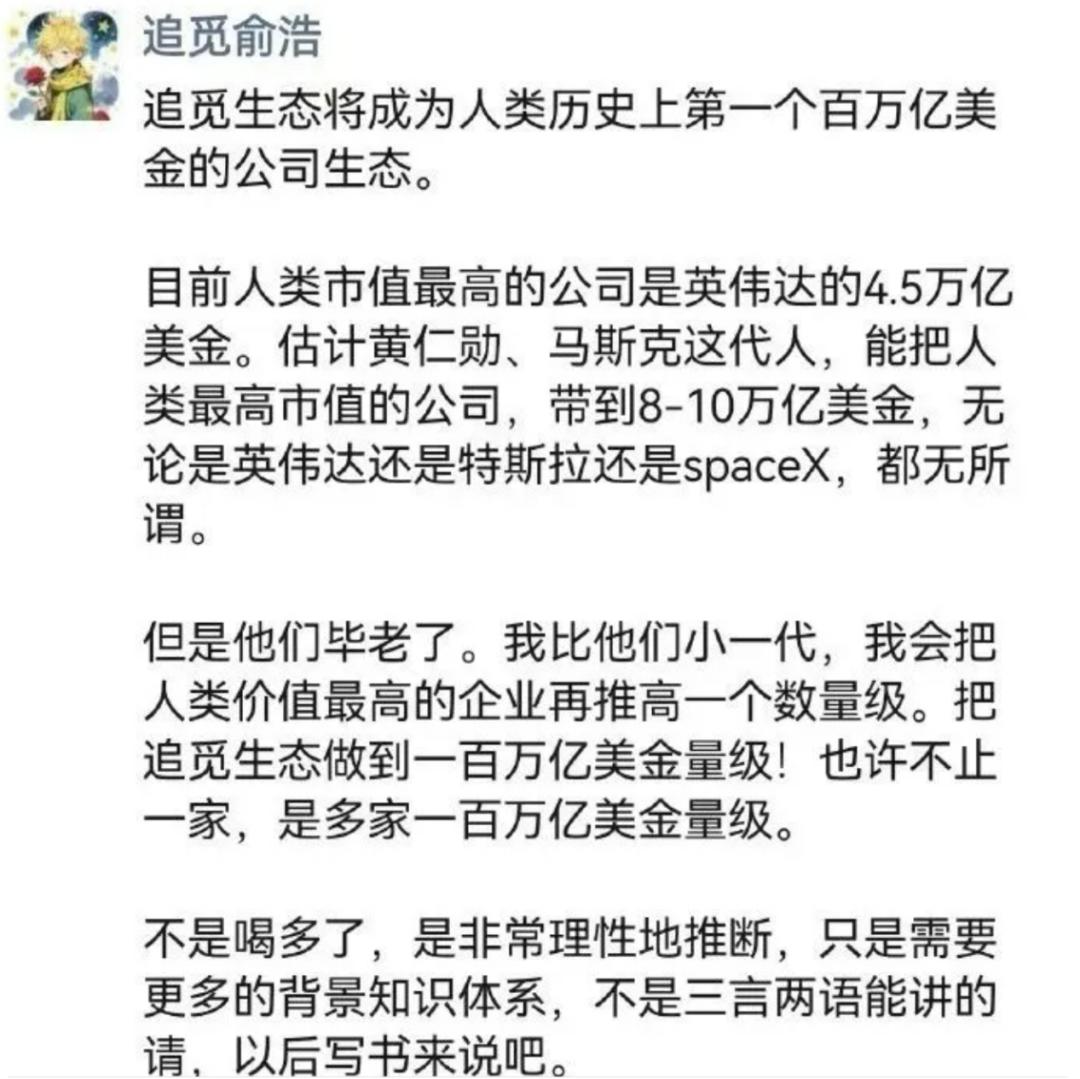 俞浩在发文中表示,目前市值最高的公司是英伟达,市值达4.5万亿美金。按他估计,黄仁勋、马斯克这代企业家,无论是英伟达还是特斯拉,亦或者SpaceX,他们能把这些公司最高市值带到8-10万亿美金。 他随即话锋一转,说自己比黄仁勋、马斯克年轻,将追觅生态做到一百万亿美金量级。也许不止一家,是多家一百万亿美金量级。最后他还强调,这一判断非常理性,并非酒后之言,具体逻辑以后写书来说。