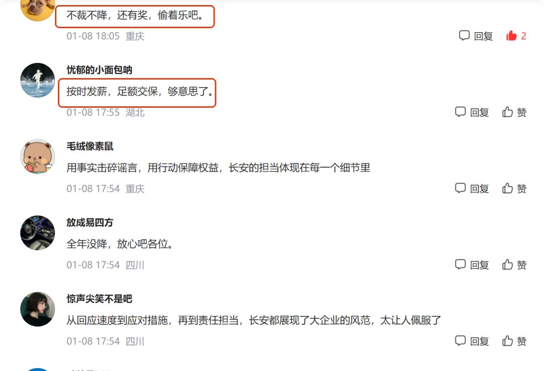 2024年长安汽车净利润不过73.21亿元,2025年前三季度来看,净利润大概率会低于2024年,即便如此,长安汽车也保障员工权益,支撑企业可持续发展。在网上引来一片赞誉。随着长安汽车官方辟谣,网络上的争议也随之反转,有来自其他车企的员工在社交平台上表示,“两天前还在嘲笑长安,现在嘲笑我自己了”。还有网友表示:“小丑竟是我自己”、“长安汽车,对不起,我承认我之前笑的太大声了”。